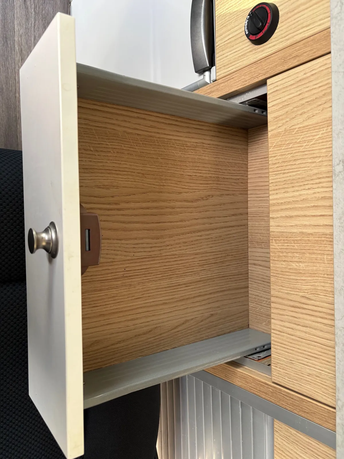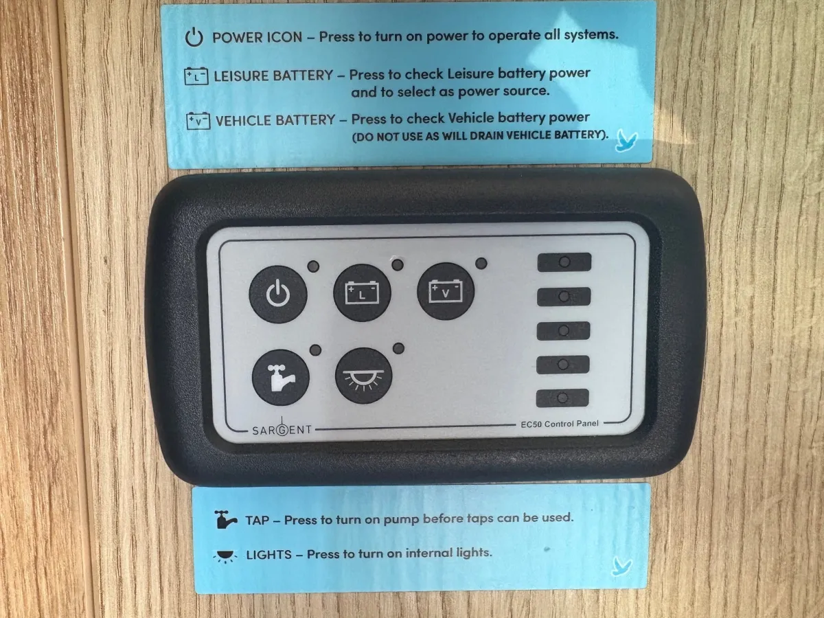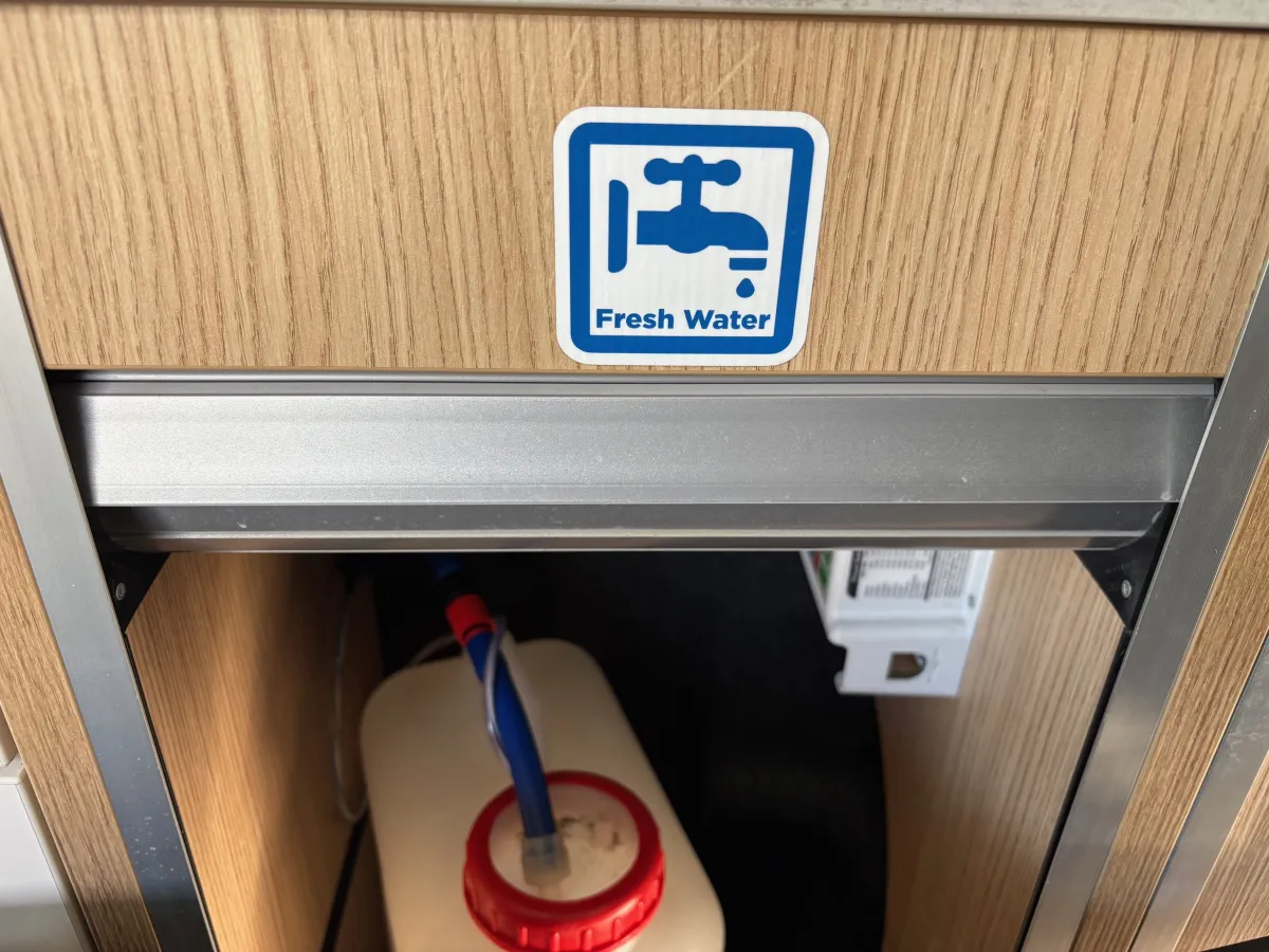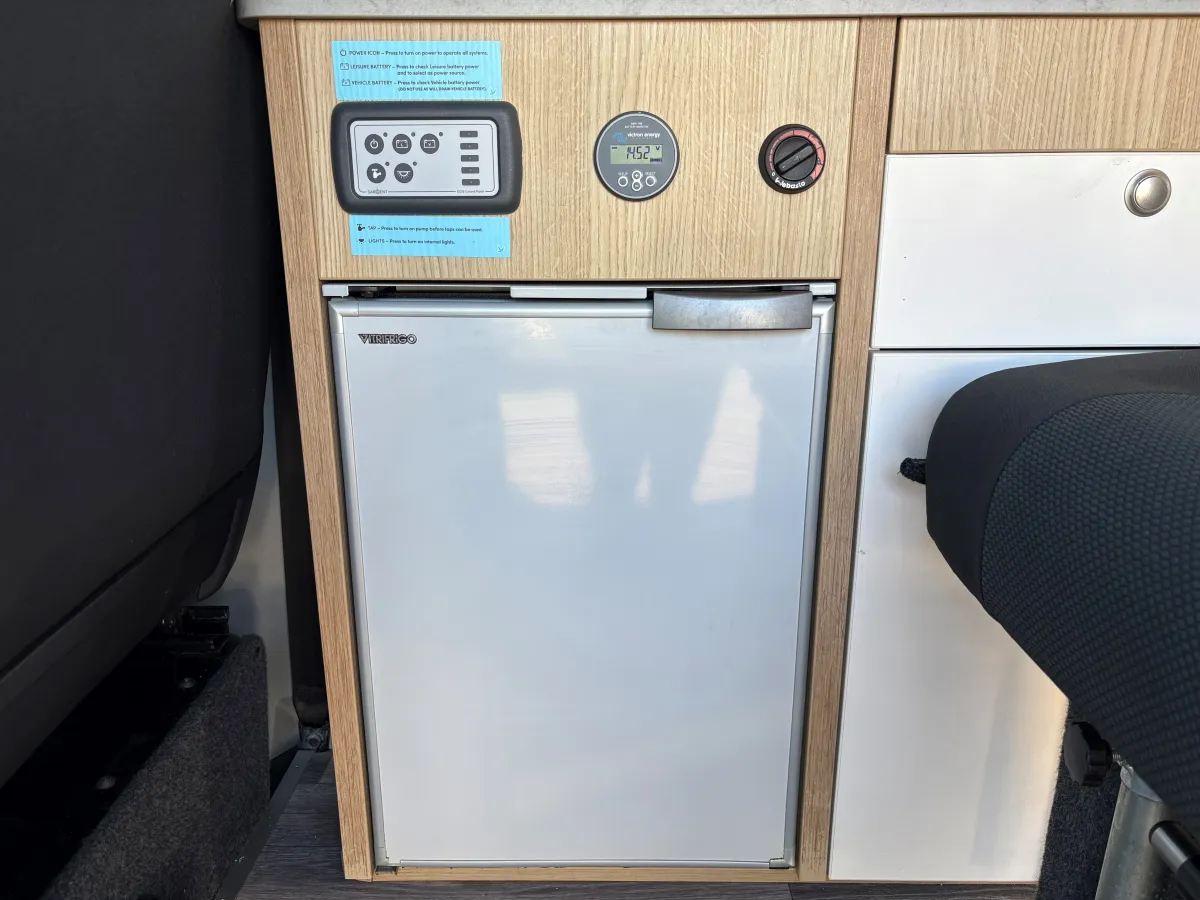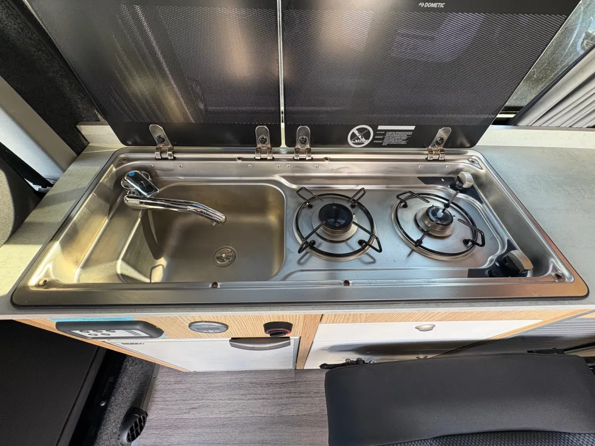 Step inside, and you'll be greeted by a meticulously crafted Vohringer factory cut ply in the kitchen, complete with sink, fridge/freezer, Dometic 2 burner gas hob and stainless steel sink.