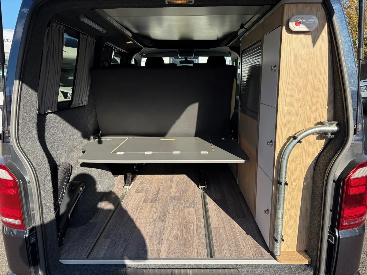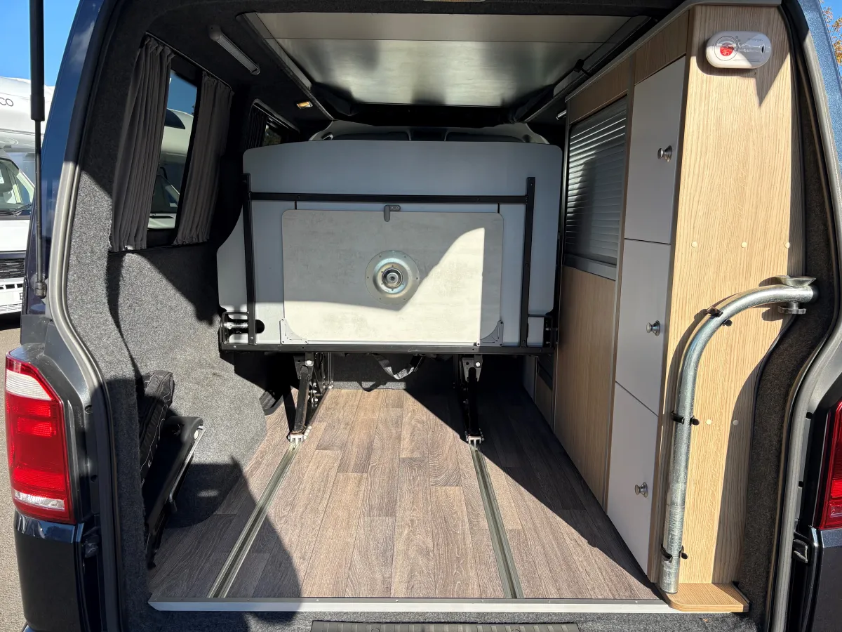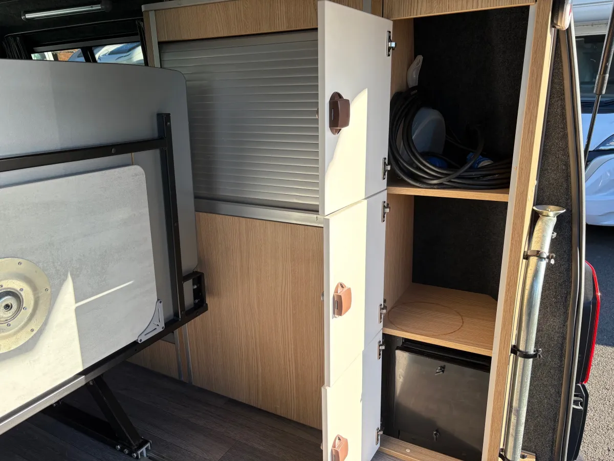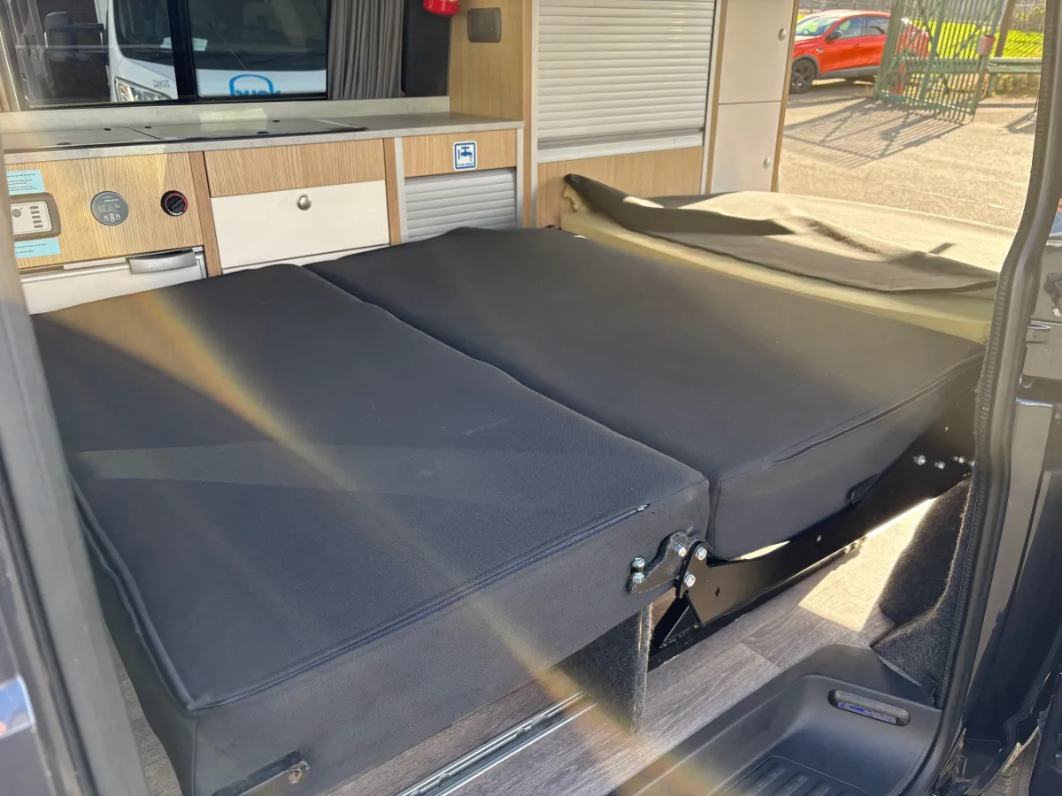 Flexibility is the name of the game, with the swivel passenger seat, allowing the whole family to gather around the table and share delicious meals. Tamba doors offer smart storage making it easy and convenient to reach your belongings and pack them away. This vehicle benefits from having the Reimo sliding seat bed system moving forward and back on rails to dramatically increase load capacity.