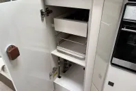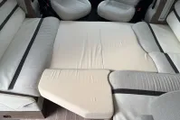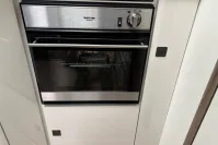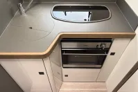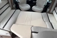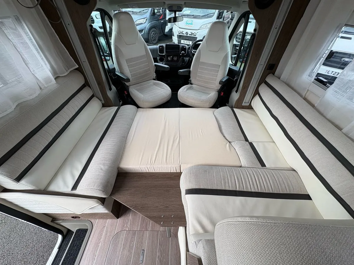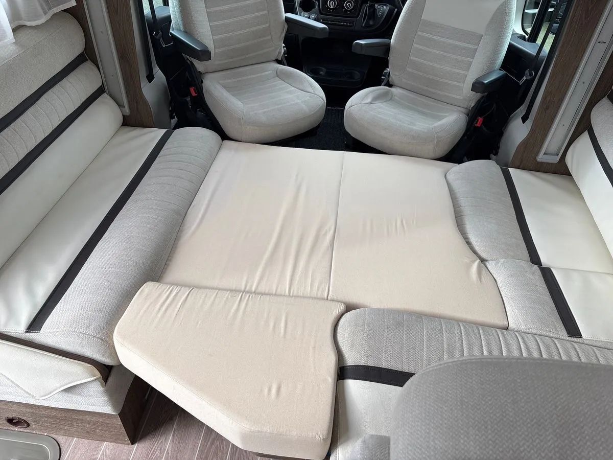 Inside, the layout is cleverly designed to maximize space and comfort. The lounge features swivel cab seats and a dinette that converts into a double bed, while an electric drop-down bed offers a second sleeping area without compromising daytime living. The kitchen is fully equipped with a three-burner gas hob, oven, grill, fridge/freezer, and generous worktop space.