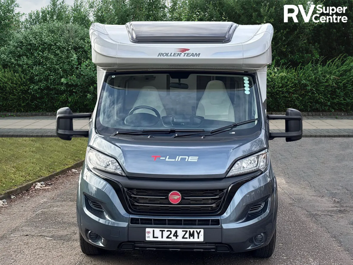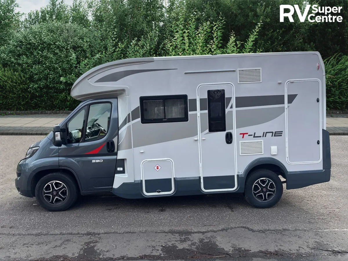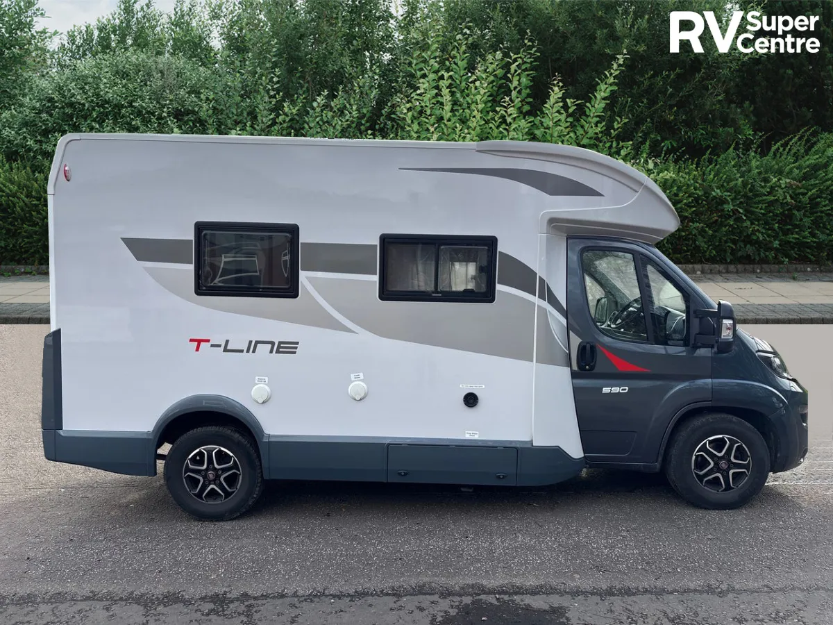 The 2024 Roller Team T-Line 590 is a compact motorhome that blends Italian design with practical luxury. Built on the Fiat Ducato chassis and powered by a 2.2L 140 BHP engine paired with a smooth 9-speed automatic gearbox, it delivers a confident drive and is easy to manoeuvre thanks to its sub-six-metre length—ideal for both seasoned travellers and newcomers.