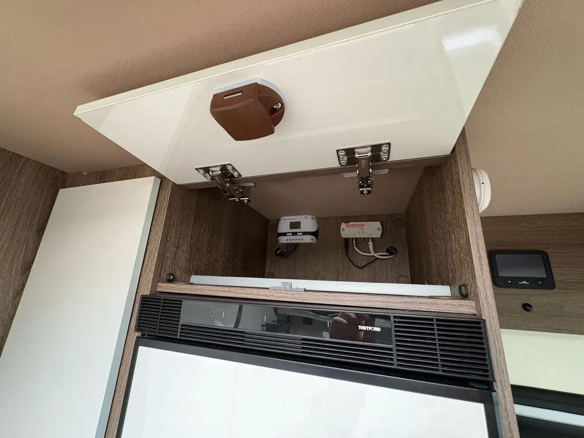 Externally, the T-Line 590 features a solar panel to keep your leisure battery charged off-grid, plus external gas BBQ and shower points for outdoor living. Alloy wheels and a reversing camera enhance both style and practicality.