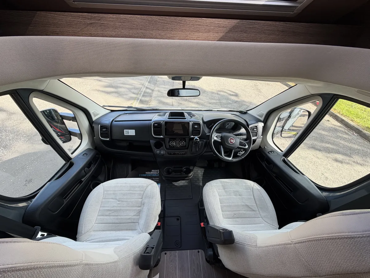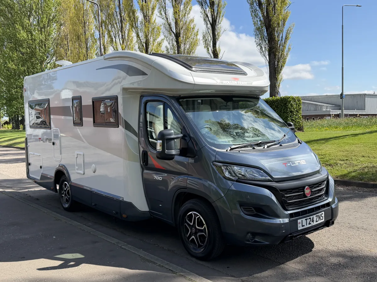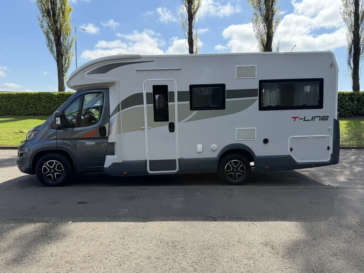The Roller Team T-Line 700 is a luxurious motorhome crafted for those who crave adventure without compromising on comfort. Powered by a robust 140bhp Fiat Ducato 2.2L engine and paired with a smooth 9-speed automatic gearbox, it delivers a confident and effortless driving experience. Features like cruise control and adjustable cabin seats ensure long-distance journeys are as comfortable as they are enjoyable.