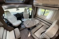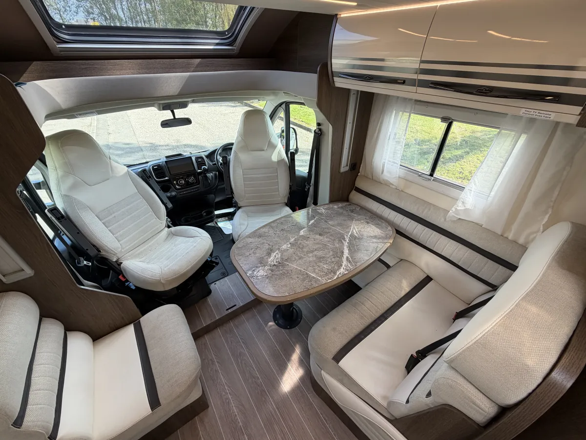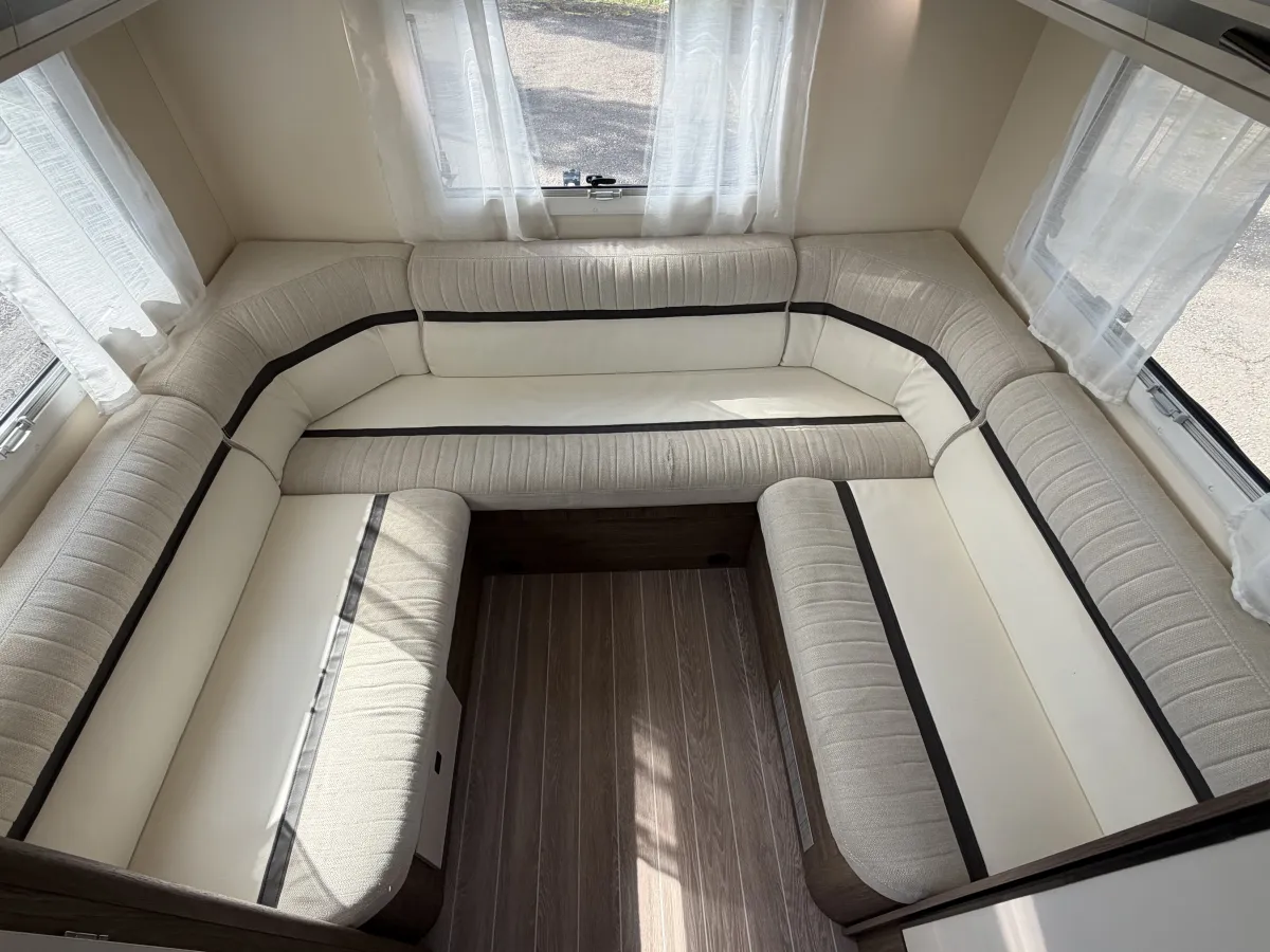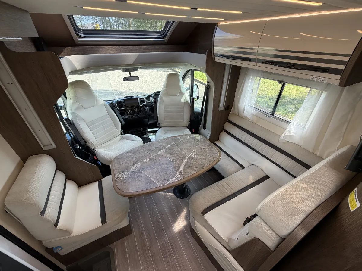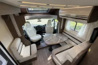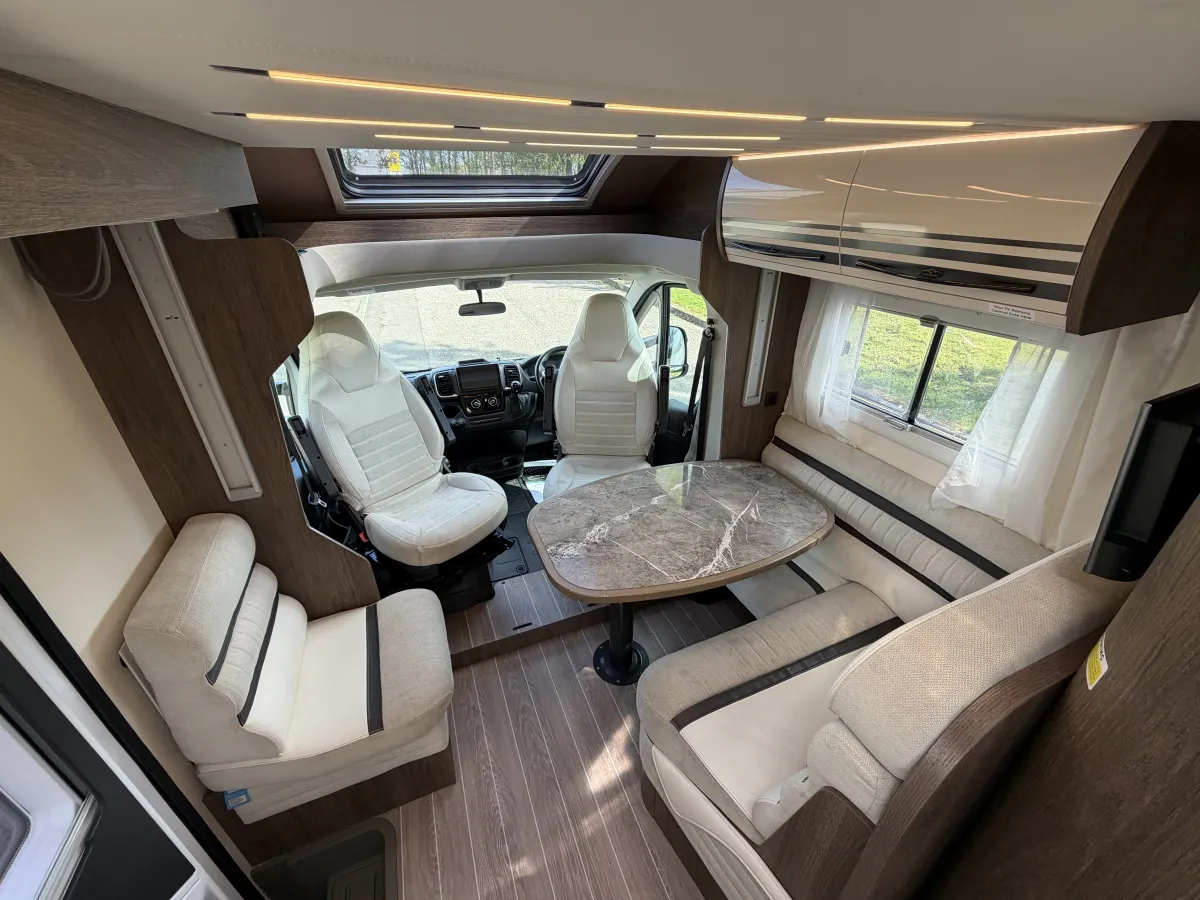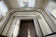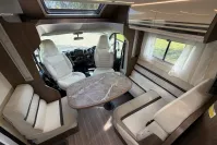 Inside, the T-Line 700 is designed with space and versatility in mind. A spacious U-shaped rear lounge offers a relaxing retreat that easily converts into a cozy sleeping area. Two electric drop-down double beds provide convenient and comfortable sleeping arrangements, while the front dinette adds extra seating and dining space. The well-equipped kitchen includes a large fridge-freezer, oven, and hob, and the combined shower and toilet cubicle ensures full self-sufficiency wherever you roam.