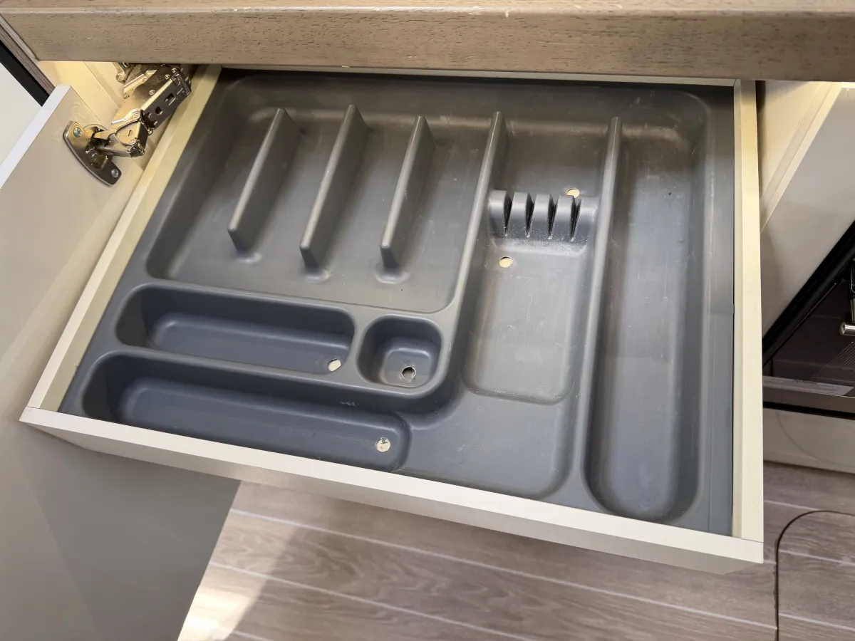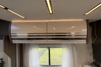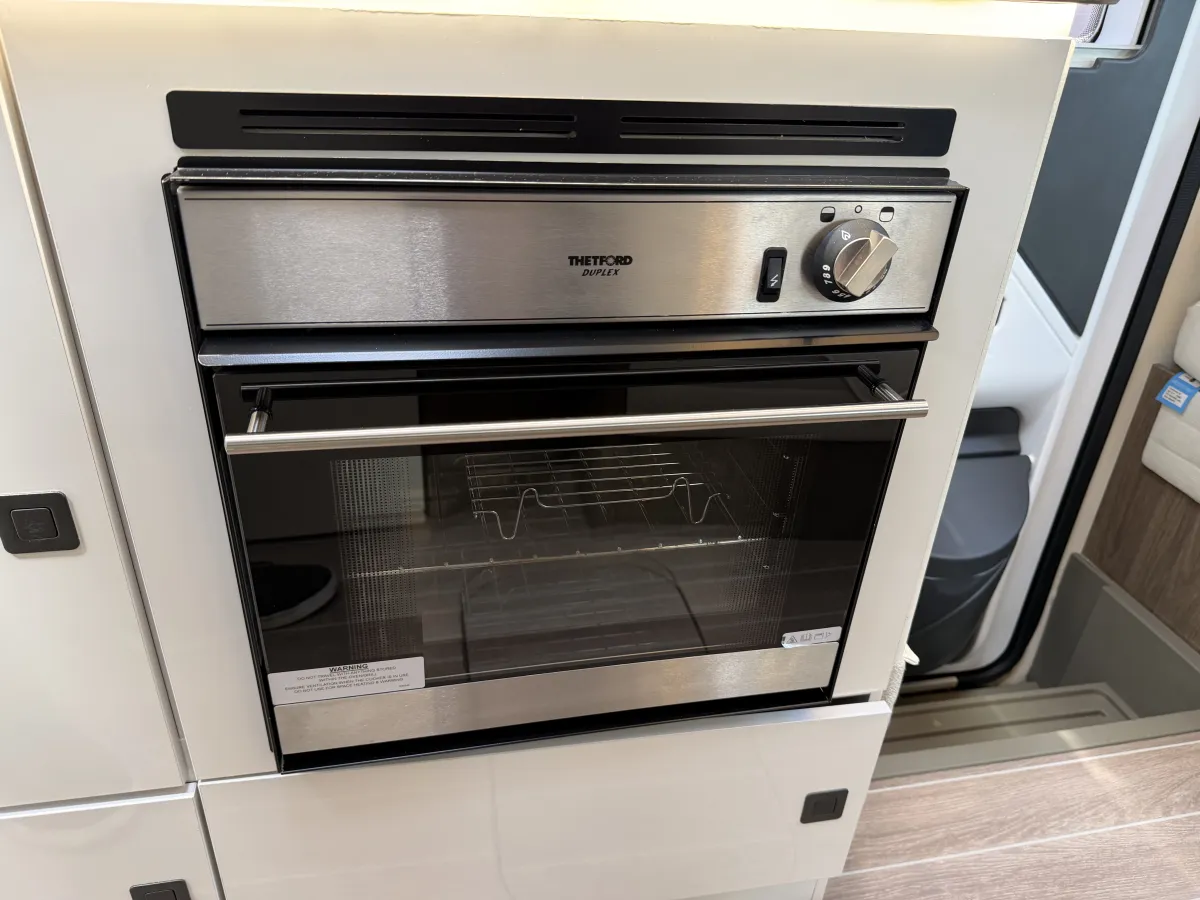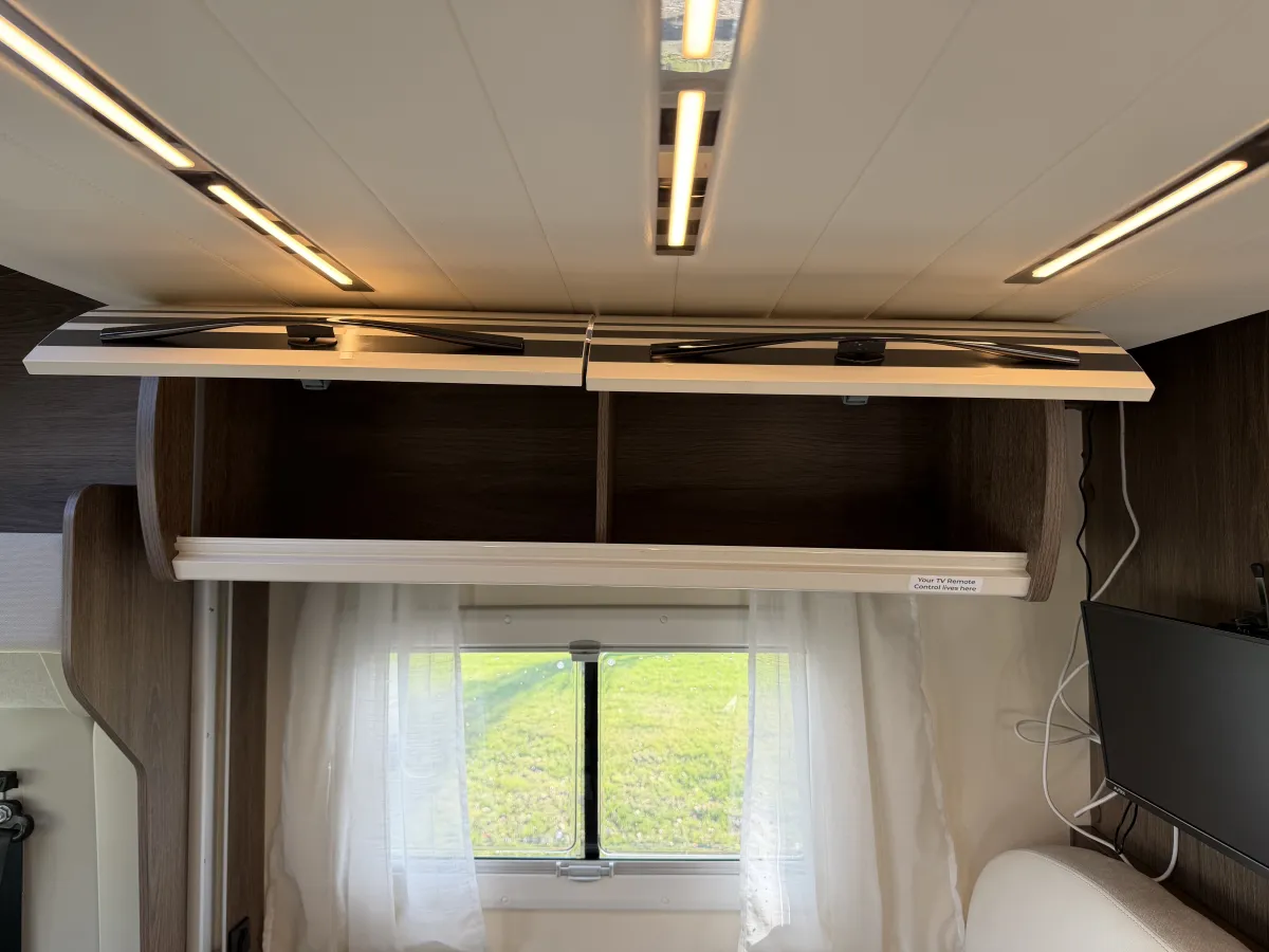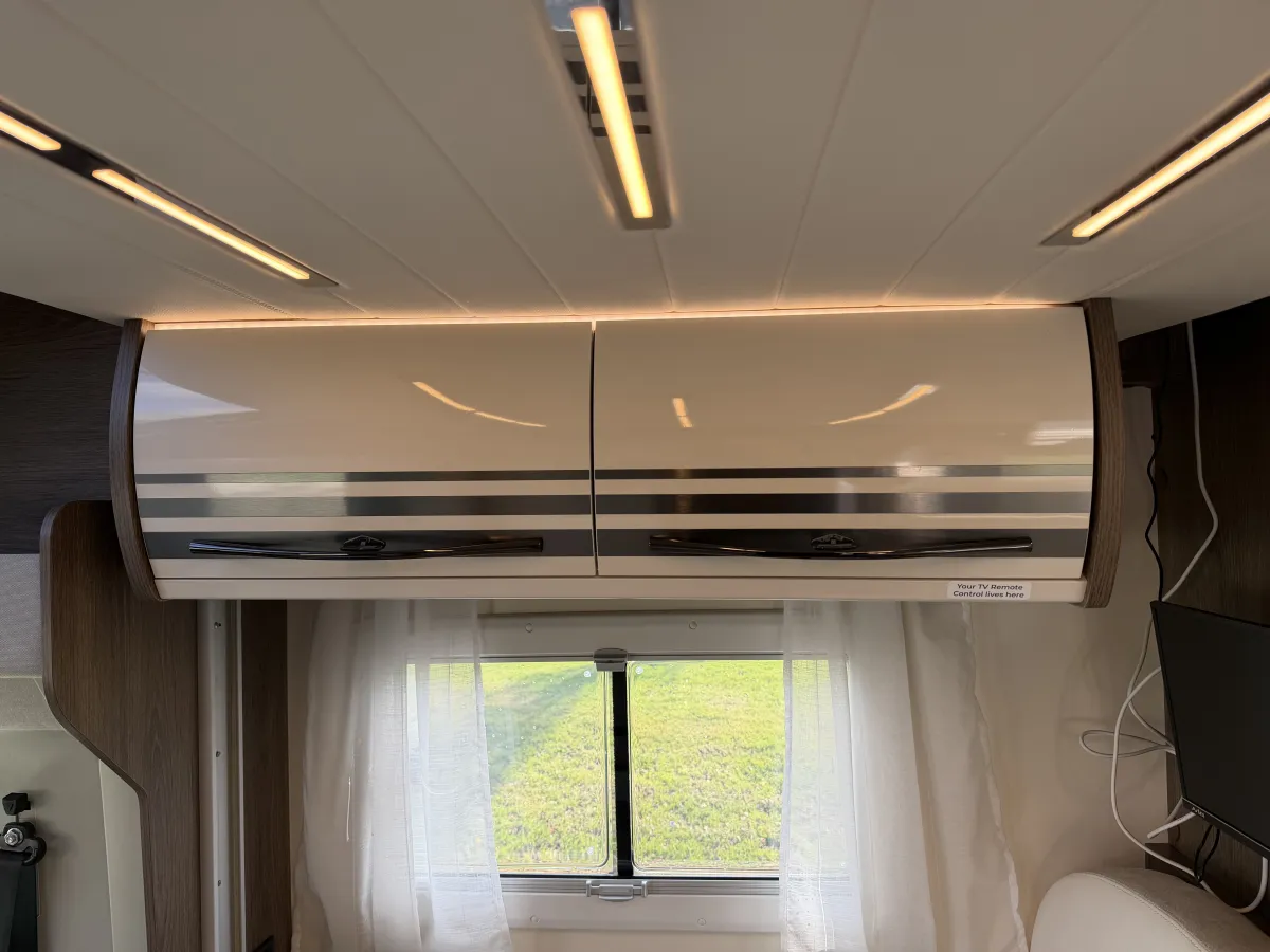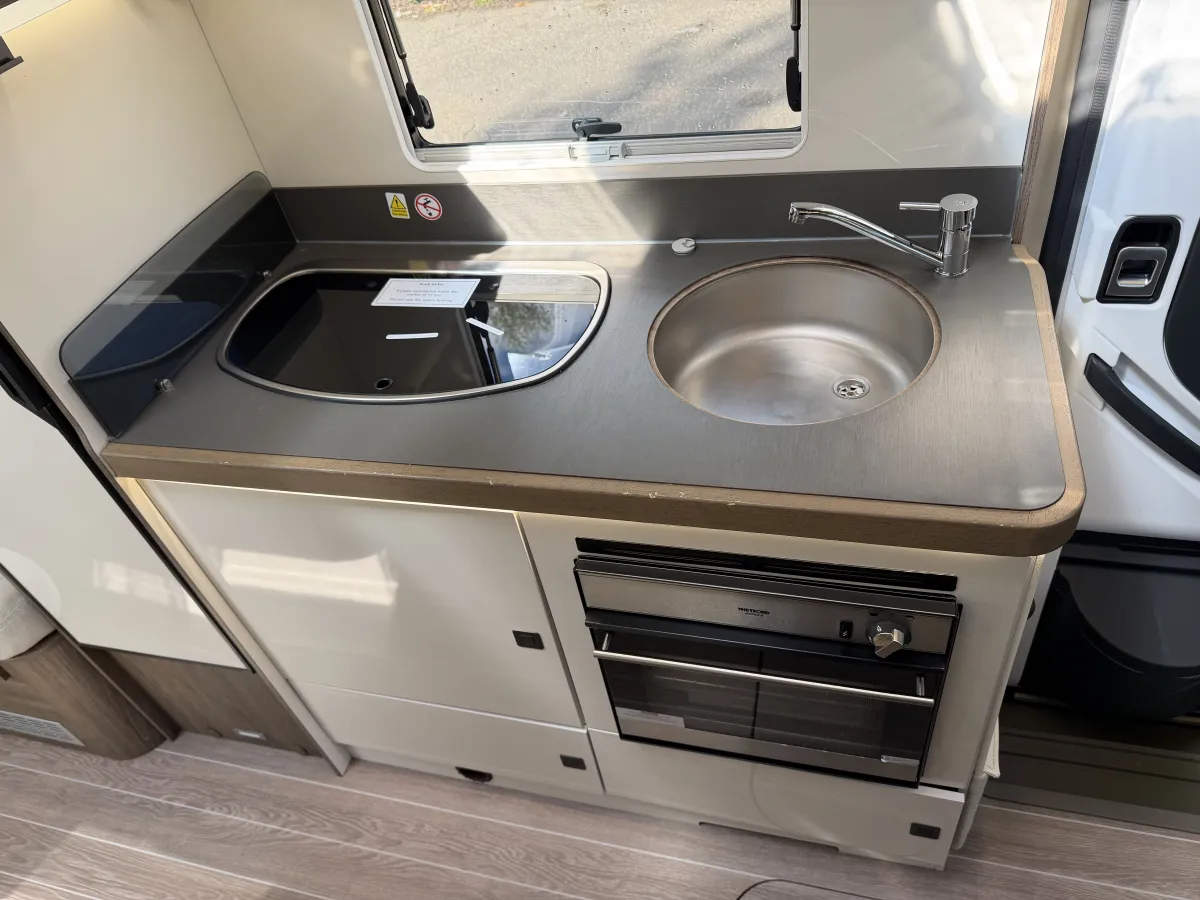 Inside, the T-Line 700 is designed with space and versatility in mind. A spacious U-shaped rear lounge offers a relaxing retreat that easily converts into a cozy sleeping area. Two electric drop-down double beds provide convenient and comfortable sleeping arrangements, while the front dinette adds extra seating and dining space. The well-equipped kitchen includes a large fridge-freezer, oven, and hob, and the combined shower and toilet cubicle ensures full self-sufficiency wherever you roam.