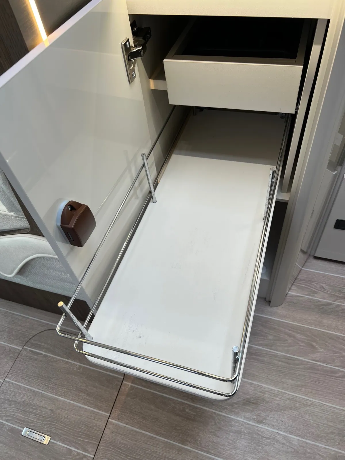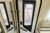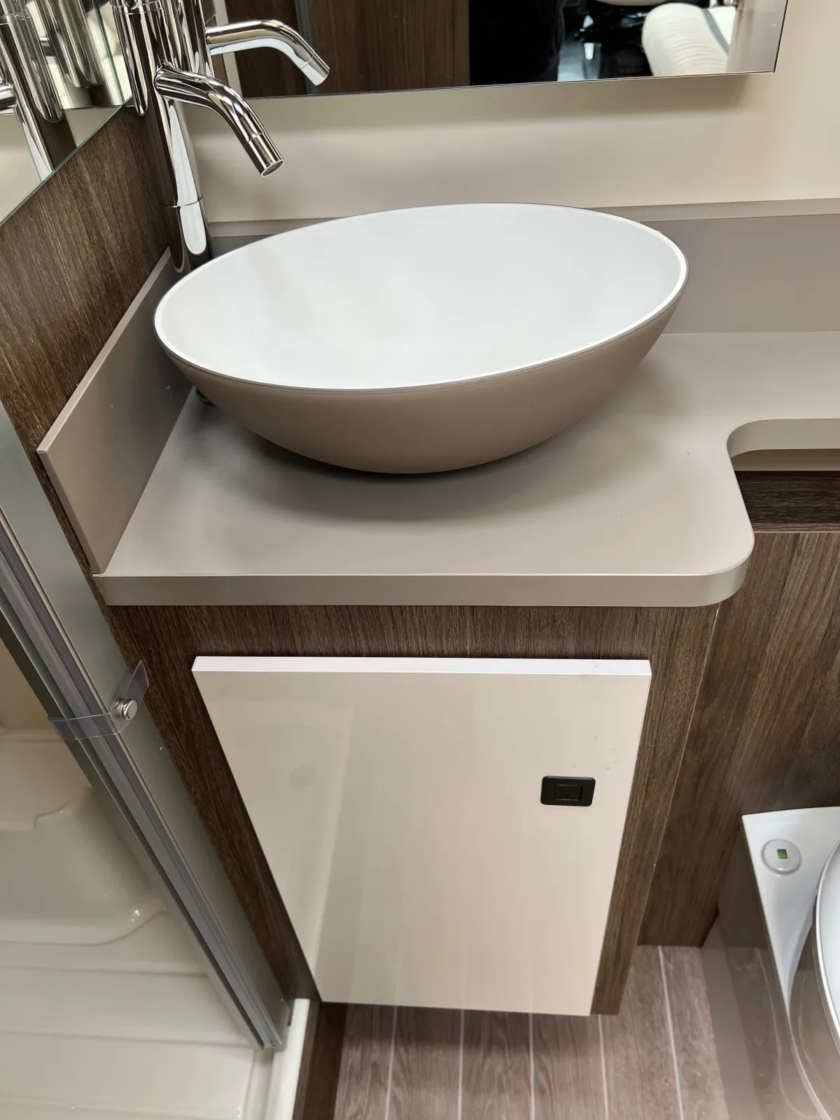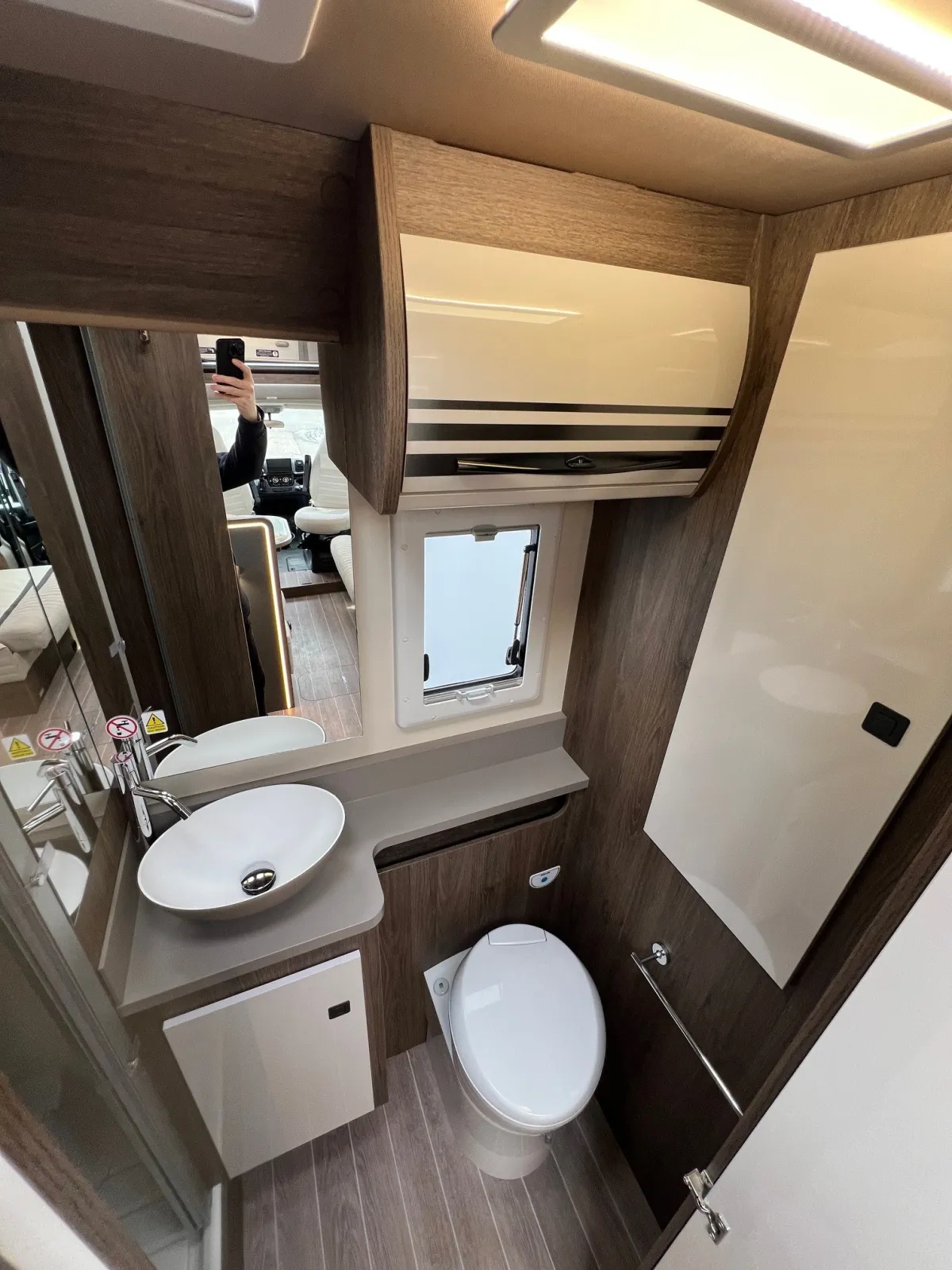 At the rear, the spacious bathroom includes a separate shower cubicle, vanity sink, and toilet—providing all the comforts of home. The Truma heating and hot water system ensures year-round comfort, whether you're touring in summer or winter.