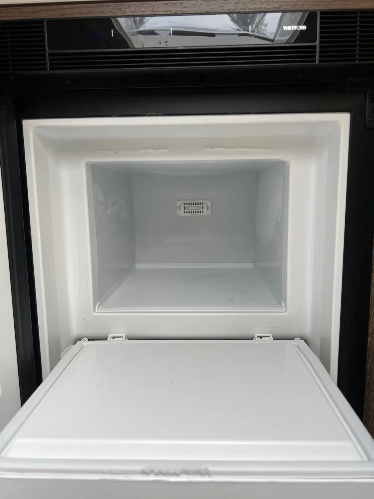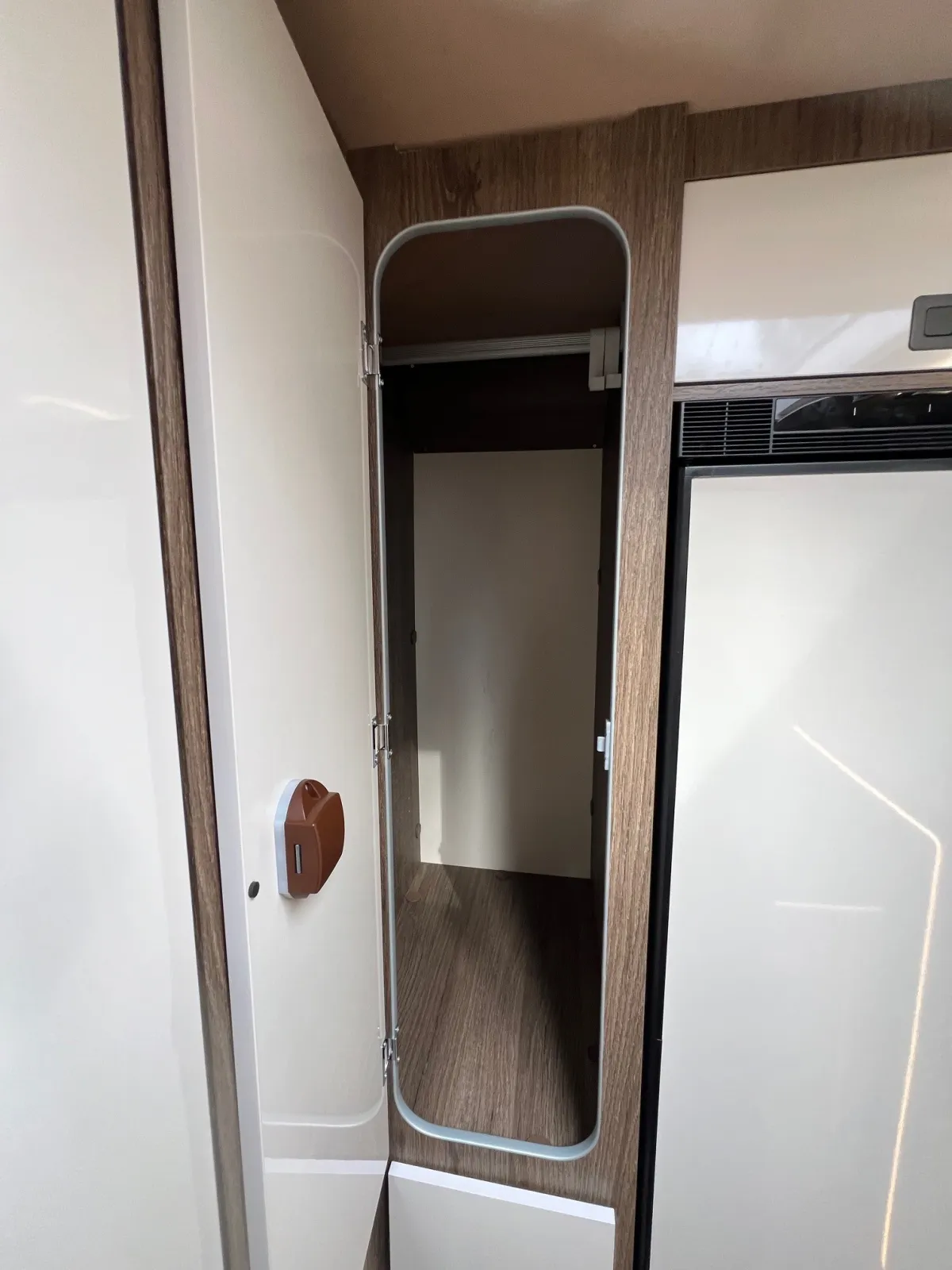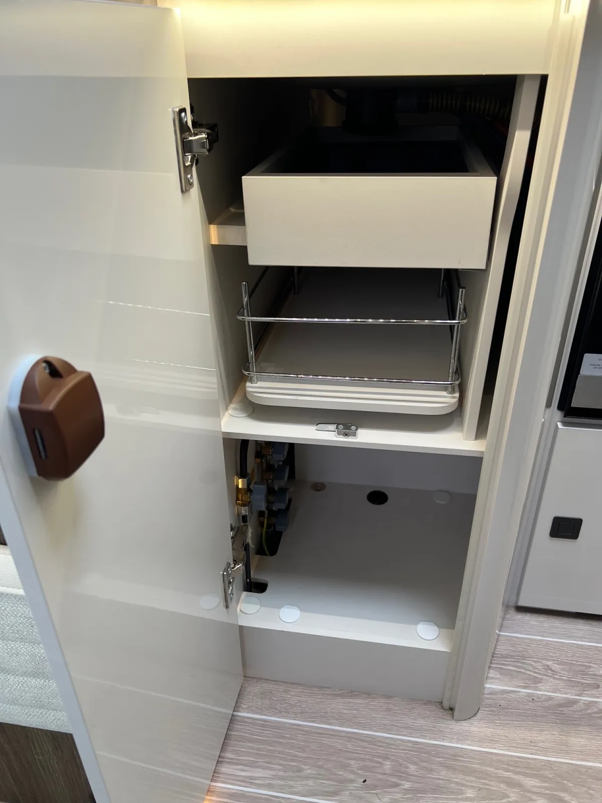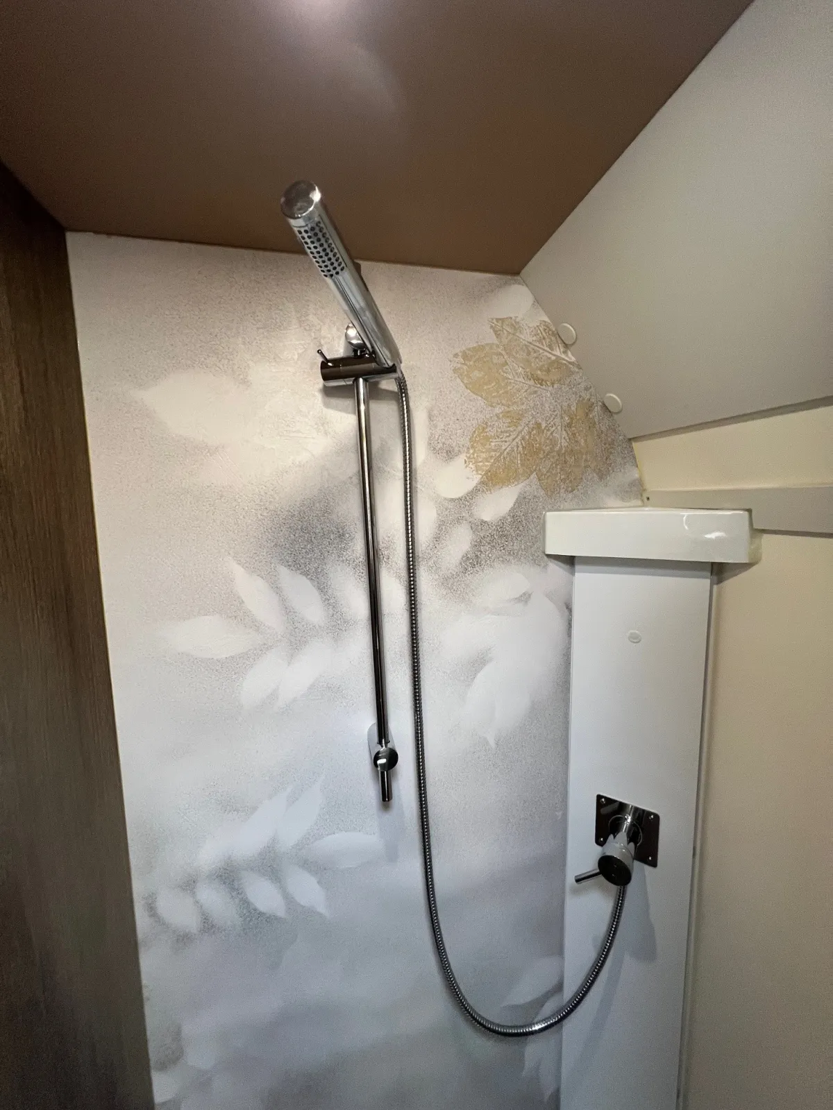 At the rear, the spacious bathroom includes a separate shower cubicle, vanity sink, and toilet—providing all the comforts of home. The Truma heating and hot water system ensures year-round comfort, whether you're touring in summer or winter.