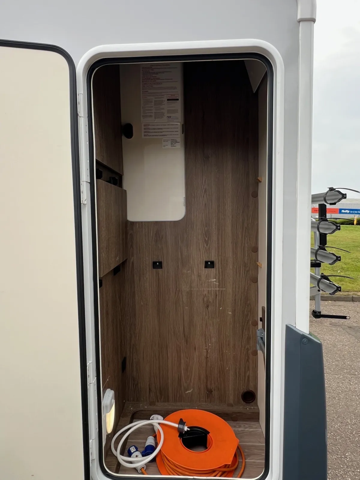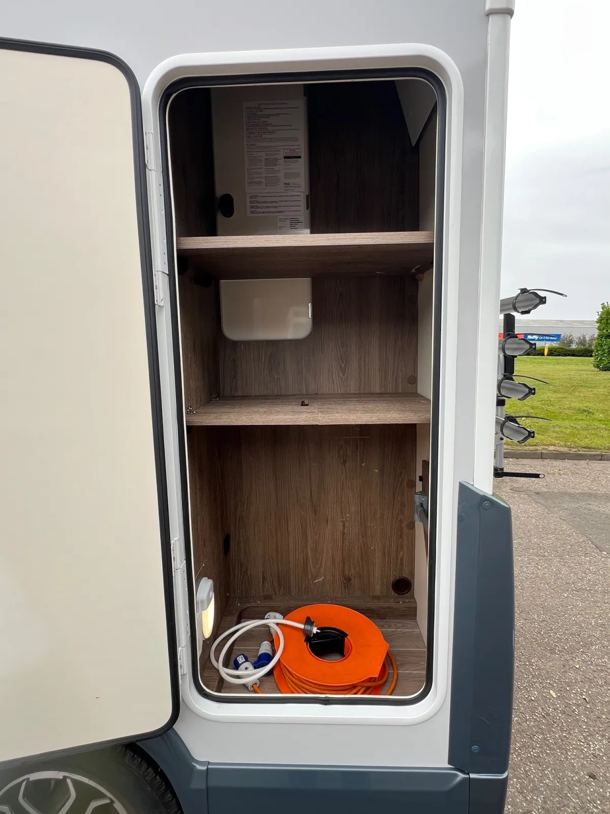 Externally, the T-Line 590 features a solar panel to keep your leisure battery charged off-grid, plus external gas BBQ and shower points for outdoor living. Alloy wheels and a reversing camera enhance both style and practicality.