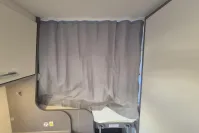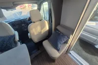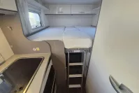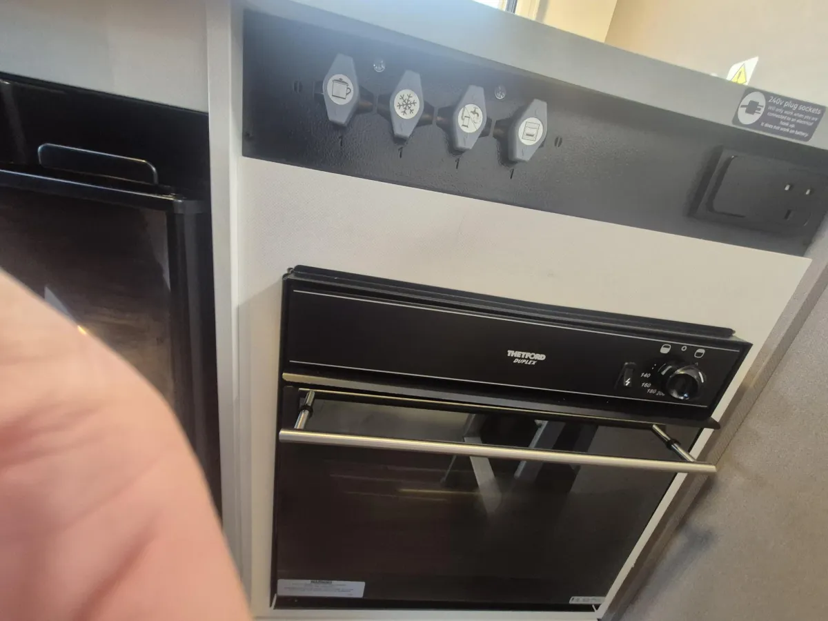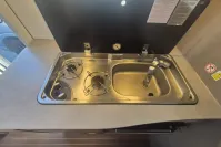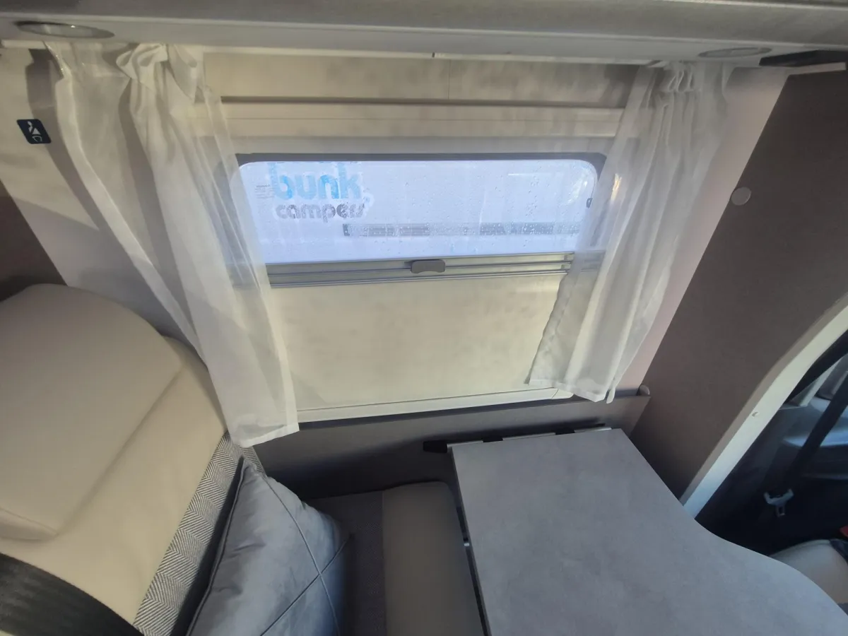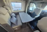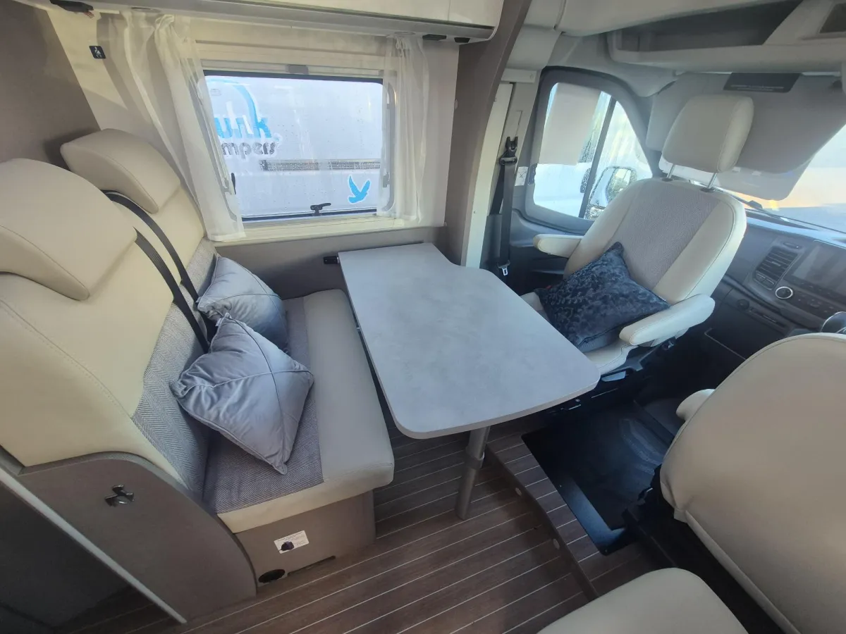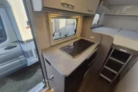 The kitchen is compact yet practical, equipped with a two-burner gas hob, fridge freezer, sink, and ample storage. The dining area seats up to five, making it suitable for entertaining guests or enjoying quiet meals on the road.
