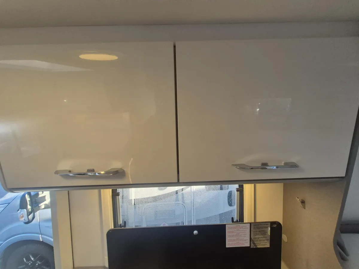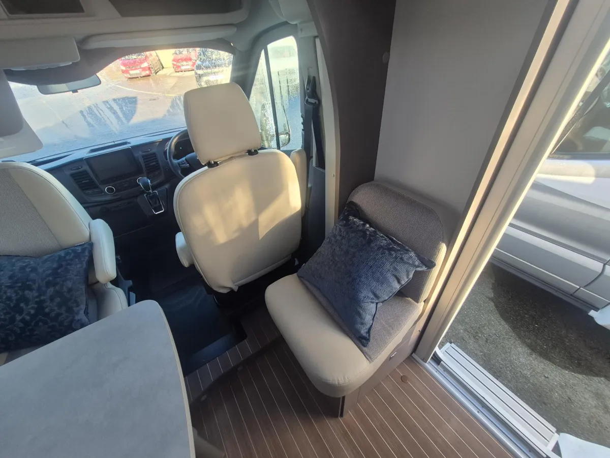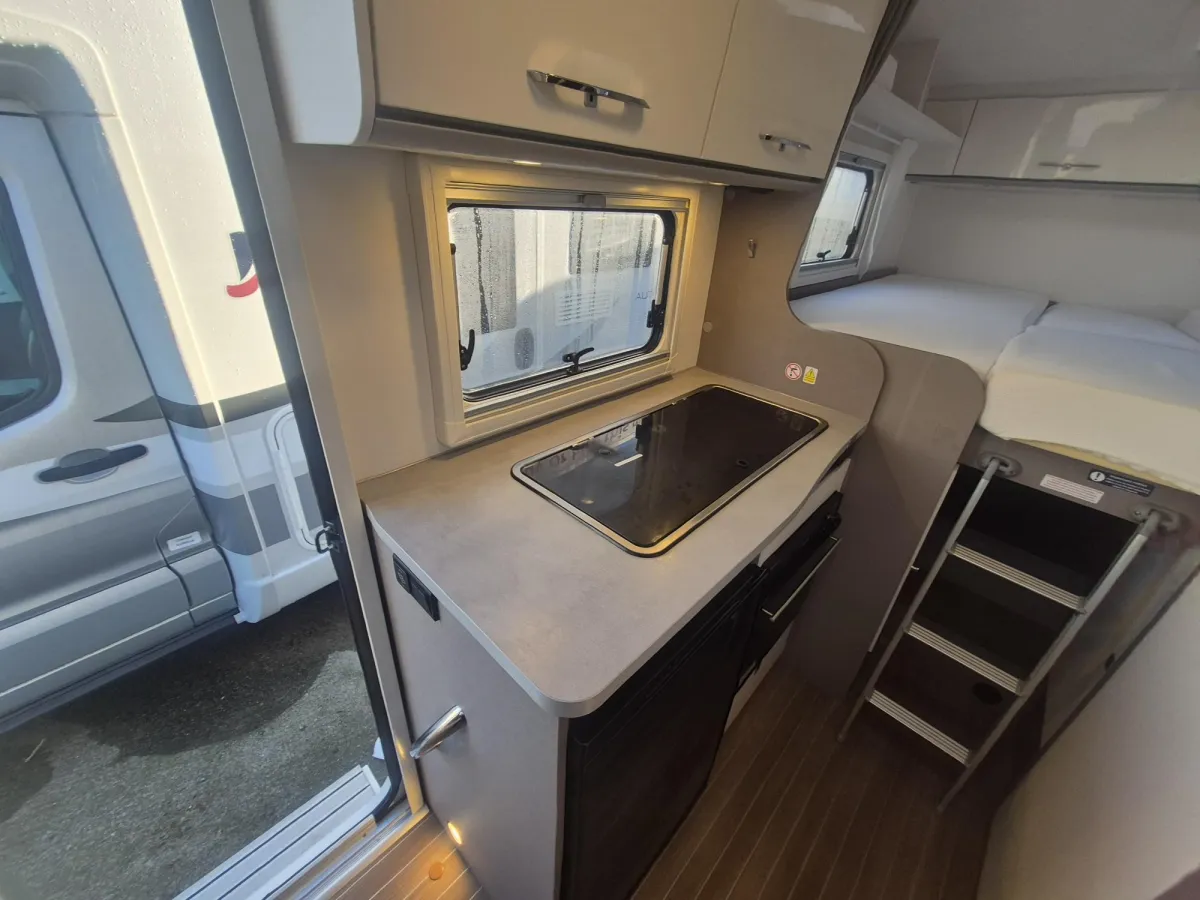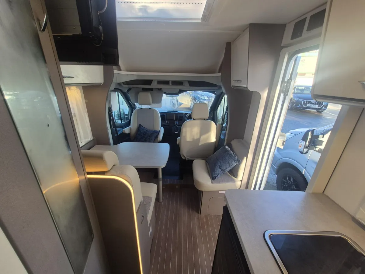 Storage is generous, with a spacious rear garage ideal for bikes, outdoor gear, or bulky items. Overhead lockers and side cupboards throughout the cabin ensure everything has its place. Additional features include modern heating systems, optional solar panels, and a range of driver assistance technologies.