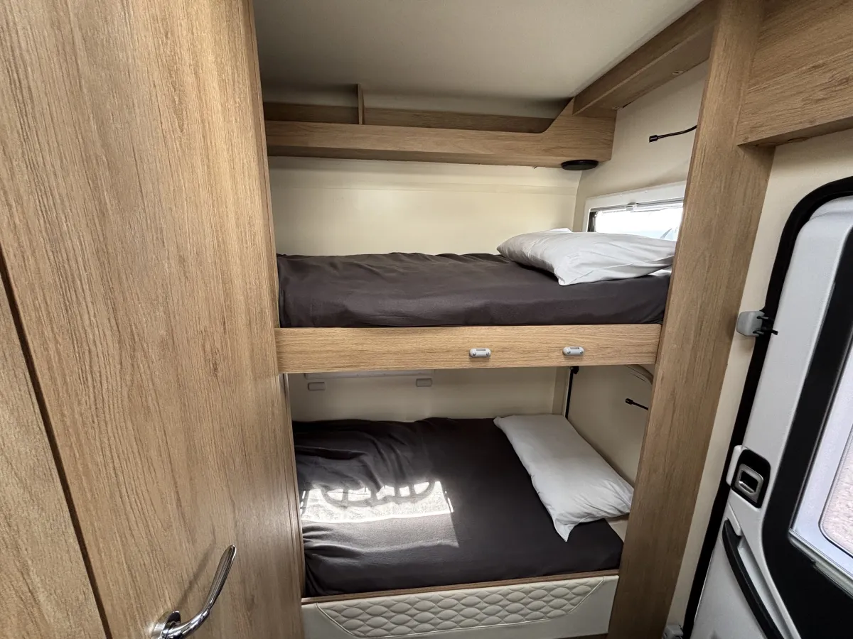 • Flexible Sleeping Arrangements: Twin Rear Bunk Beds + Electric Drop-Down Double Bed + Convertible Dinette
