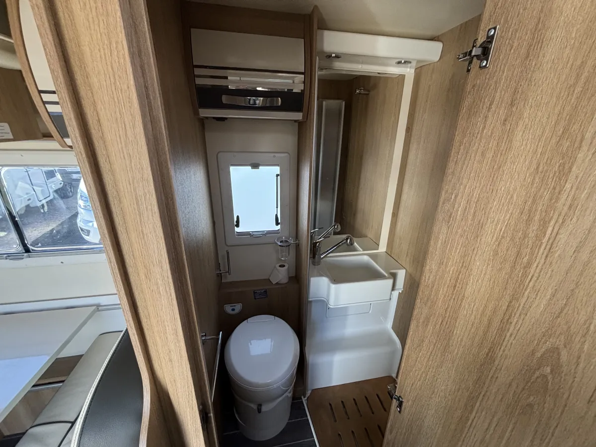 • Compact Washroom with Cassette Toilet, Integrated Shower, and Vanity Basin