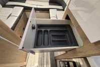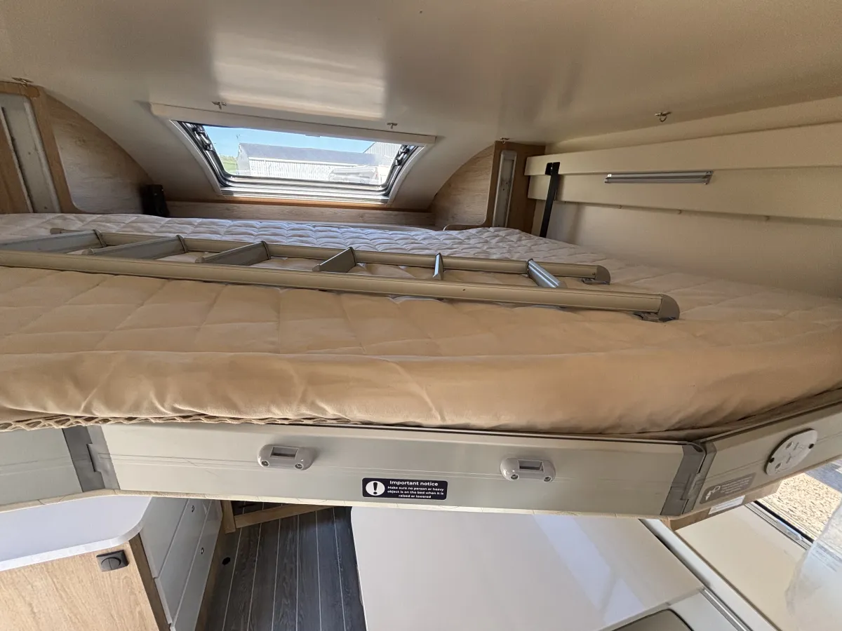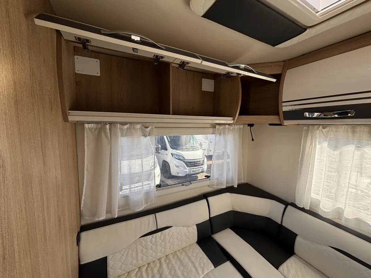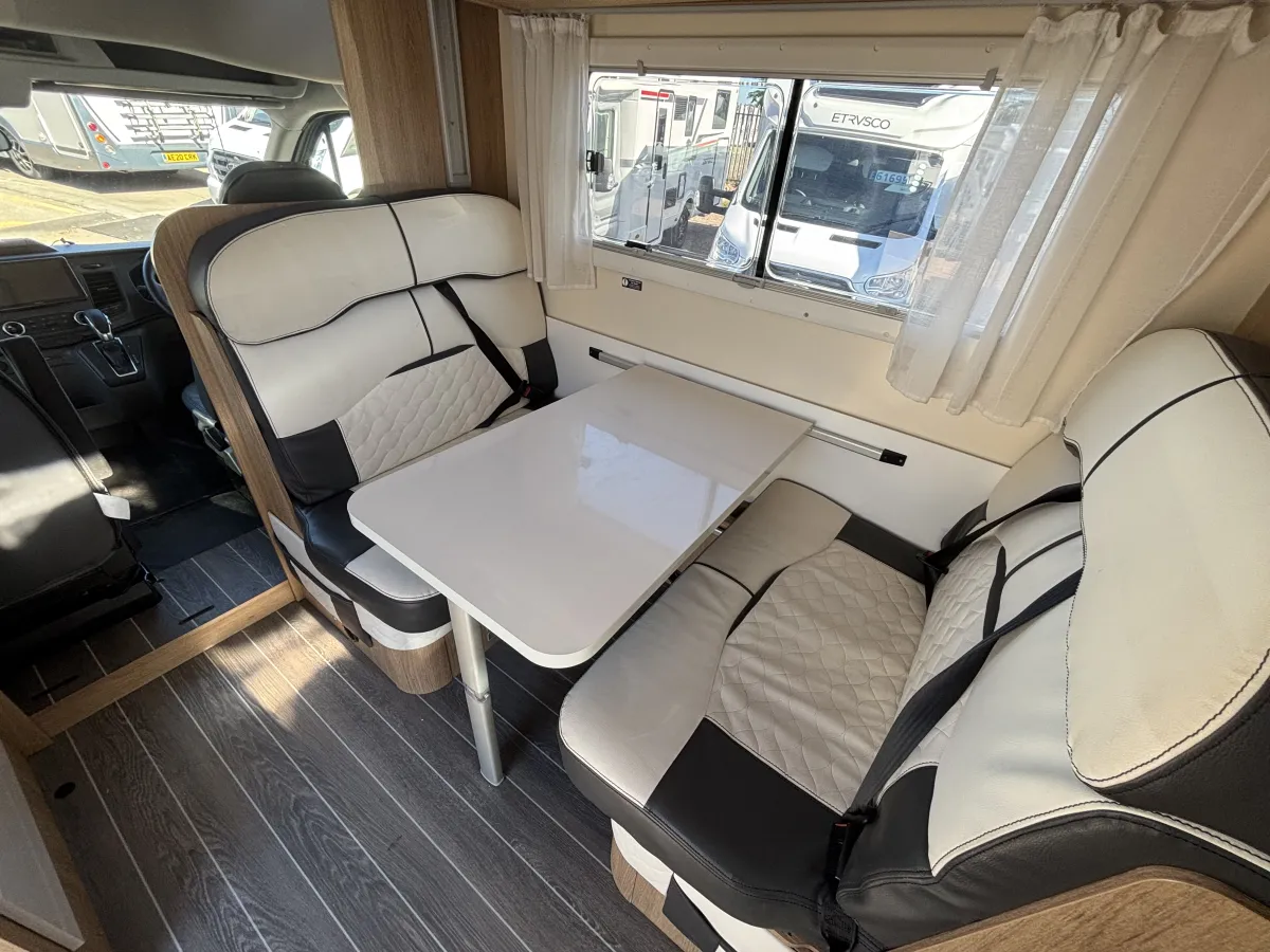 • Mid Dinette with Twin Bench Seats and Central Table + Electric Drop-Down Double Bed