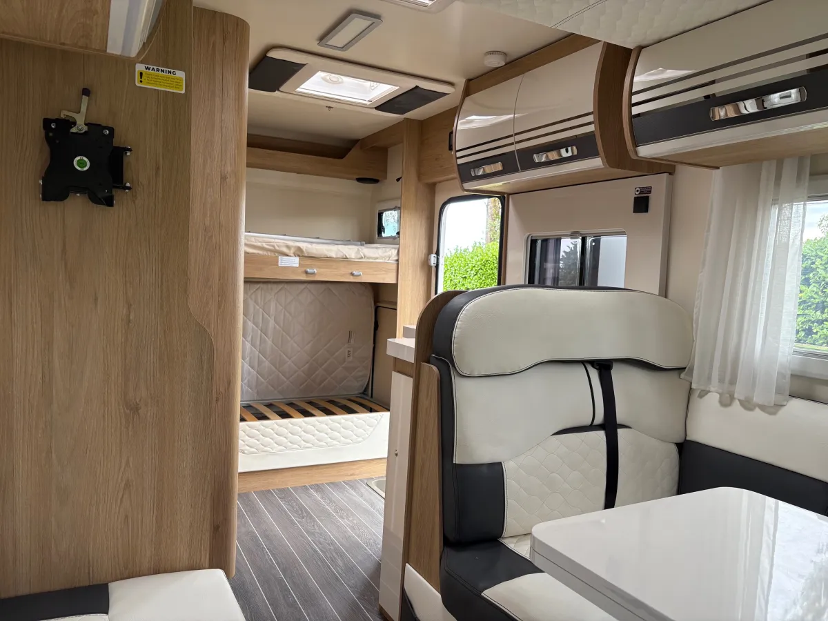 • Flexible Sleeping Arrangements: Twin Rear Bunk Beds + Electric Drop-Down Double Bed + Convertible Dinette
