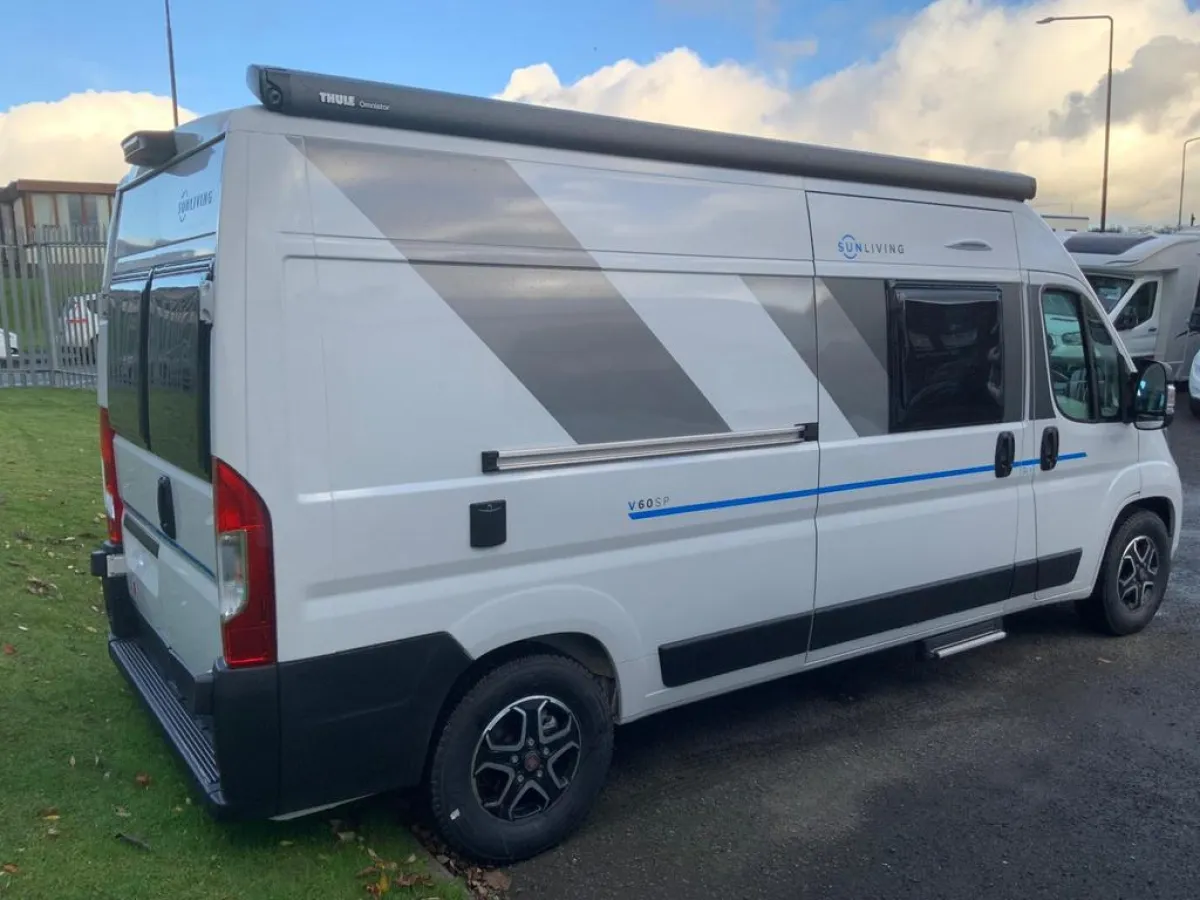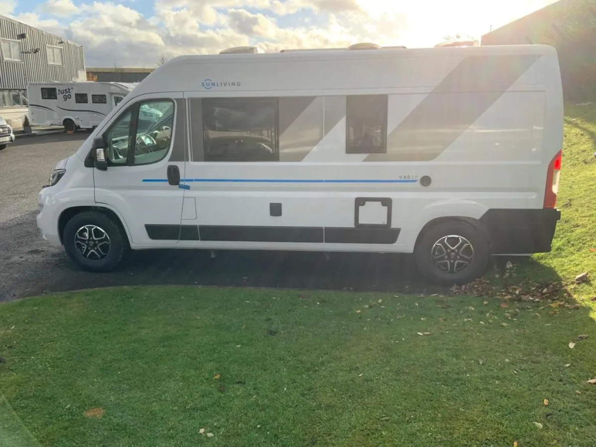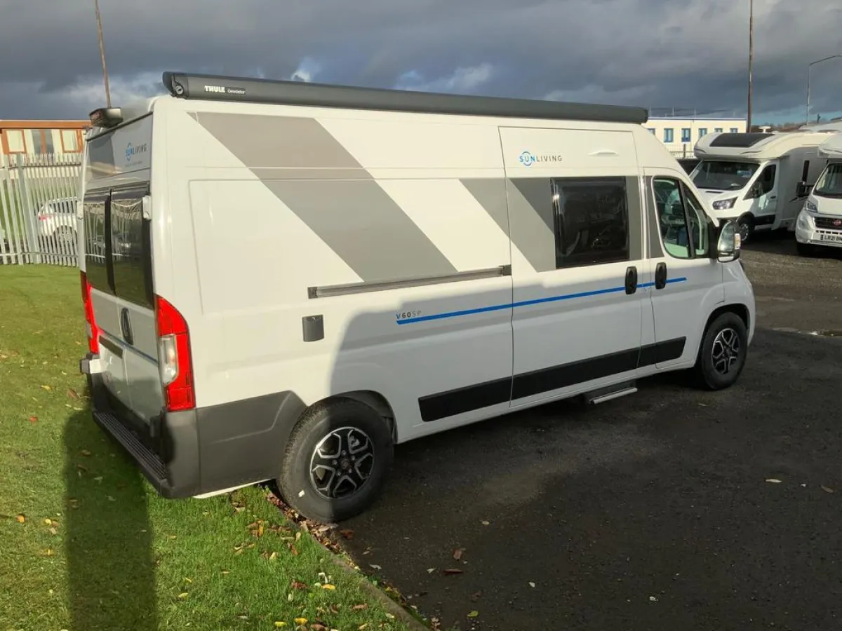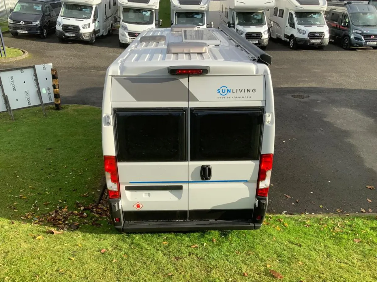 Brand new Sun Living V60SP made by Adria. Adria are the leading motorhome builders in Europe having made over 600,000 vehicles since 1965. This fantastic 2 berth motorhome is built on the ever popular Fiat Ducato chassis with the 140bhp 2.3 dsl engine and award winning 9 speed auto gearbox. Specified from the factory with over £7k worth of options including awning, 7" touchscreen, LED Headlights, solar panels, Ducato luxury pack and more this van is ready to take exploring. We have a limited stock available for immediate delivery, beat the queues with the RV Supercentre. Get in touch with our friendly team to arrange a viewing - open 6 days Mon-Saturday.