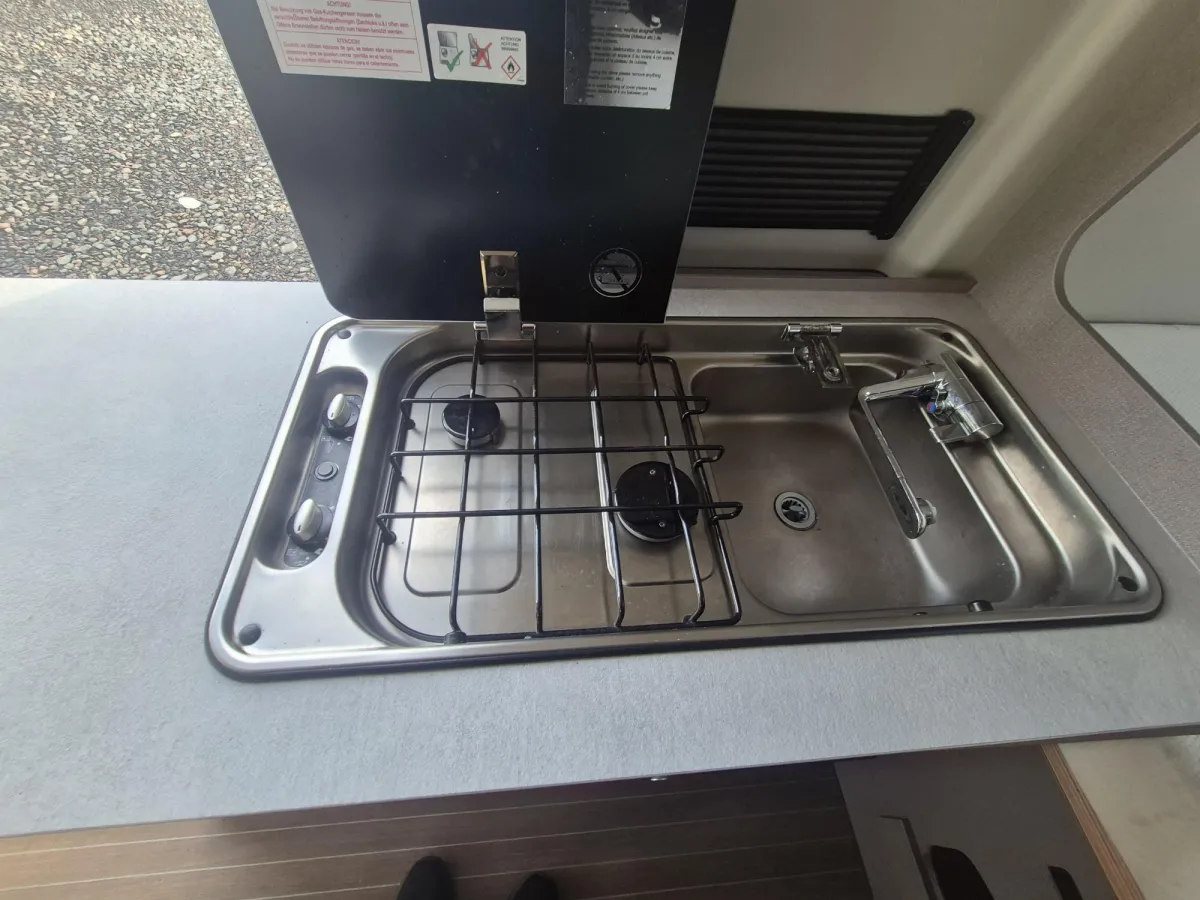 - Fully Equipped Kitchen with two-burner gas hob, fridge, stainless-steel sink, and clever storage solutions for organised travel